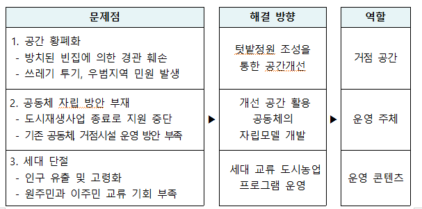 - (사업연계) 도시재생사업 기반과 도시농업 콘텐츠를 연계한 공동체 회복