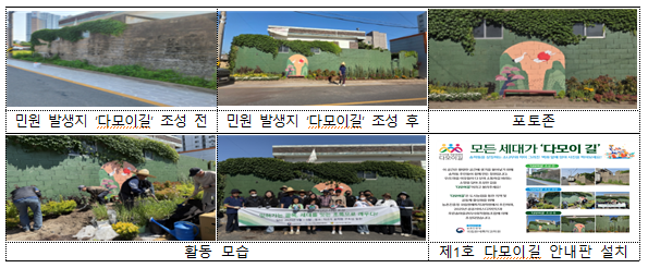 - (결과) 지역 주민의 마을환경 만족도 증가 : 빈집 담장에 ‘다모이길’ 조성 후 철거 보류(익산시 송학동 행정복지센터)