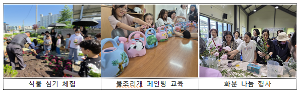 - ‘다모이길’ 활용 세대 교류 도시농업 프로그램 운영 : (식물)전 세대고령층의 작물재배, 청년층의 꽃다발 지식 나눔, (미술) 청년층+아동층예술인 청년의 아동 대상 나만의 물조리개 페인팅 교육, (음악) 전 세대지역 주민의 악기 연주와 함께하는 식물 나눔 음악회 개최