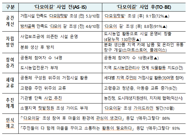 - (결과) 지역주민의 공동체 의식 강화 및 거점시설 활용도 증가 : (공동체 의식) 세대 간 교류에 따른 인식 변화 및 프로그램 만족도, (활용증가) ‘다모임 텃밭정원’을 활용한 식물 교육 의뢰 접수