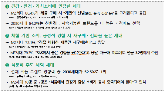 - 따라서, 변화에 민감하고 확산력이 높은 세대를 중심으로 새로운 소비층을 설계할 필요가 있음 : 건강 ․ 환경 ․ 가치소비에 민감하고, 식문화 트렌드를 주도하는 2030세대는 임산물에 대한 인식 전환과 소비 확산을 유도할 수 있는 전략 소비층으로 적합