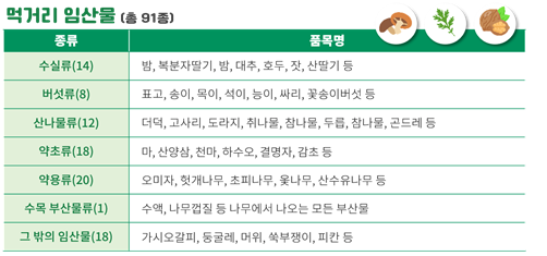 - 임산물은 산림에서 생산되는 산물로 농산물이나 구별되는 산림자원이며, 먹거리 임산물(숲푸드)은 그 중 식용 또는 가공 가능한 품목을 말함