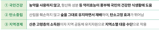 - 먹거리 임산물은 단순한 먹거리를 넘어 국민건강, 탄소중립, 지역경제에 기여하는 식재료로 가치를 가짐