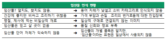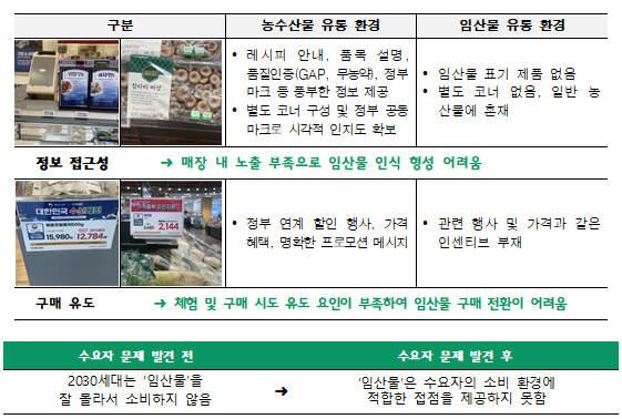 - 대형마트 현장 방문 결과, 농산물과 수산물은 별도 코너와 정부 마크로 인식과 접근성이 높았으나, 임산물은 별도 구역 없이 일반 농산물에 혼재되어 있음