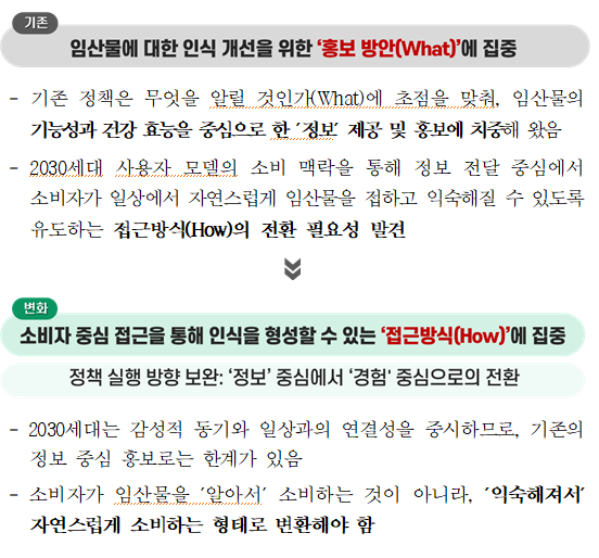 ○ 임산물 소비를 정보 중심에서, 일상 속 경험 기반 구조로 전환하여 공감과 가치소비로 연결하는 전략이 필요
