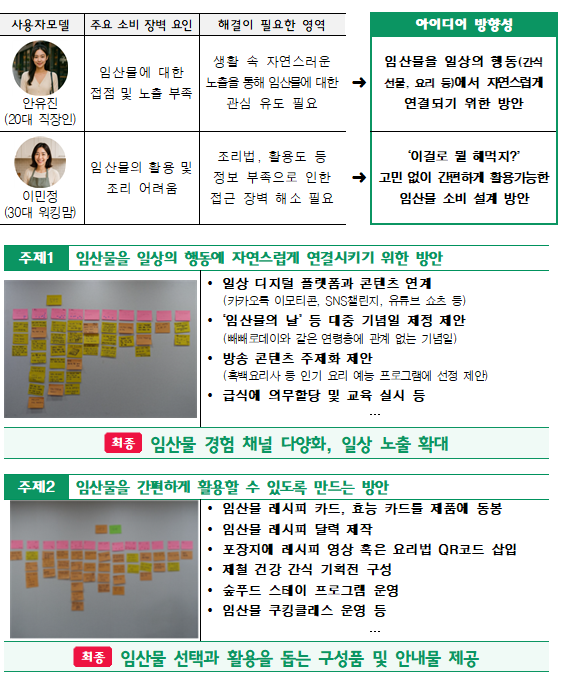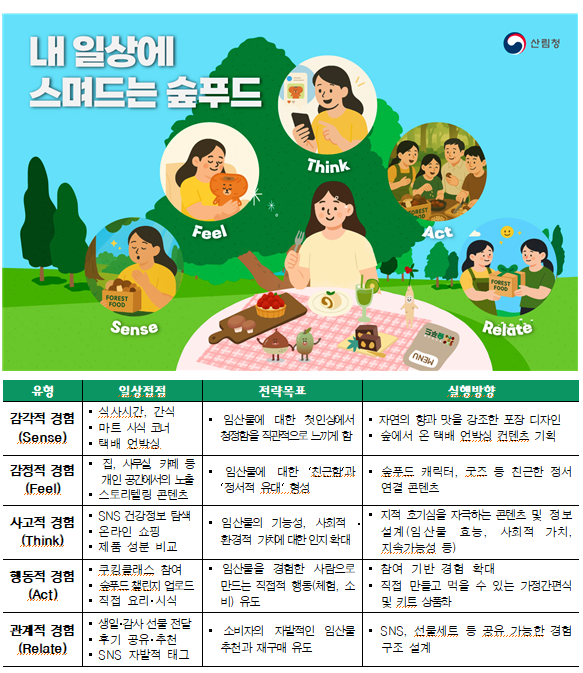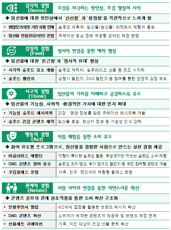 - 일상 속 경험을 ‘숲푸드’ 브랜드로 연결하고, 자연・환경・임업인과상생으로 확장하는 실행전략 마련