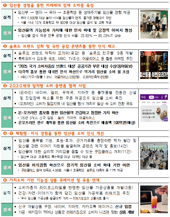 성과로는 숲푸드 캐릭터 9종과 챌린지를 통한 대국민 인식 확산, 초등학교·유치원 급식 연계를 통한 긍정적 인식 상승(25.9%→85.2%), 온라인 플랫폼 입점을 통한 예상 매출 100억 원 창출, 쿠킹클래스 만족도 4.86점 등이 확인되었다. 또한 숲푸드를 친환경·지속가능 먹거리로 포지셔닝하면서 임산물을 건강·환경·문화와 연결한 새로운 소비 구조를 제시했다.