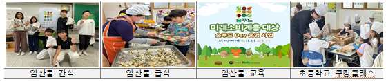 • 건강한 임산물을 활용한 요리법을 제공하여 임산물의 실제 조리 활용도를 높이고, 직접 요리・시식해봄으로써 심리적 거리감을 좁히고 생활 속 실천을 유도하는 체험형 프로그램 운영