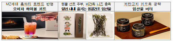 • 소비자층의 라이프스타일을 반영한 임산물 가공상품을 개발, 감도 높은 브랜딩을 더하고, 또한 건강・자연・이야기가 함께 담긴 임산물 가공제품 리패키징 추진으로 가치소비로의 전환을 유도