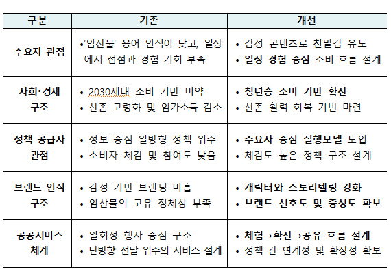 ① (임신부) 임신부 대상 태아의 건강한 발달과 산모의 면역력 유지를 위한 영양 중심 임산물 섭취경험 제공으로 임신기부터 임산물을 ‘좋은 먹거리’로 인식시키는 초기 인지기반 조성(’25.9)