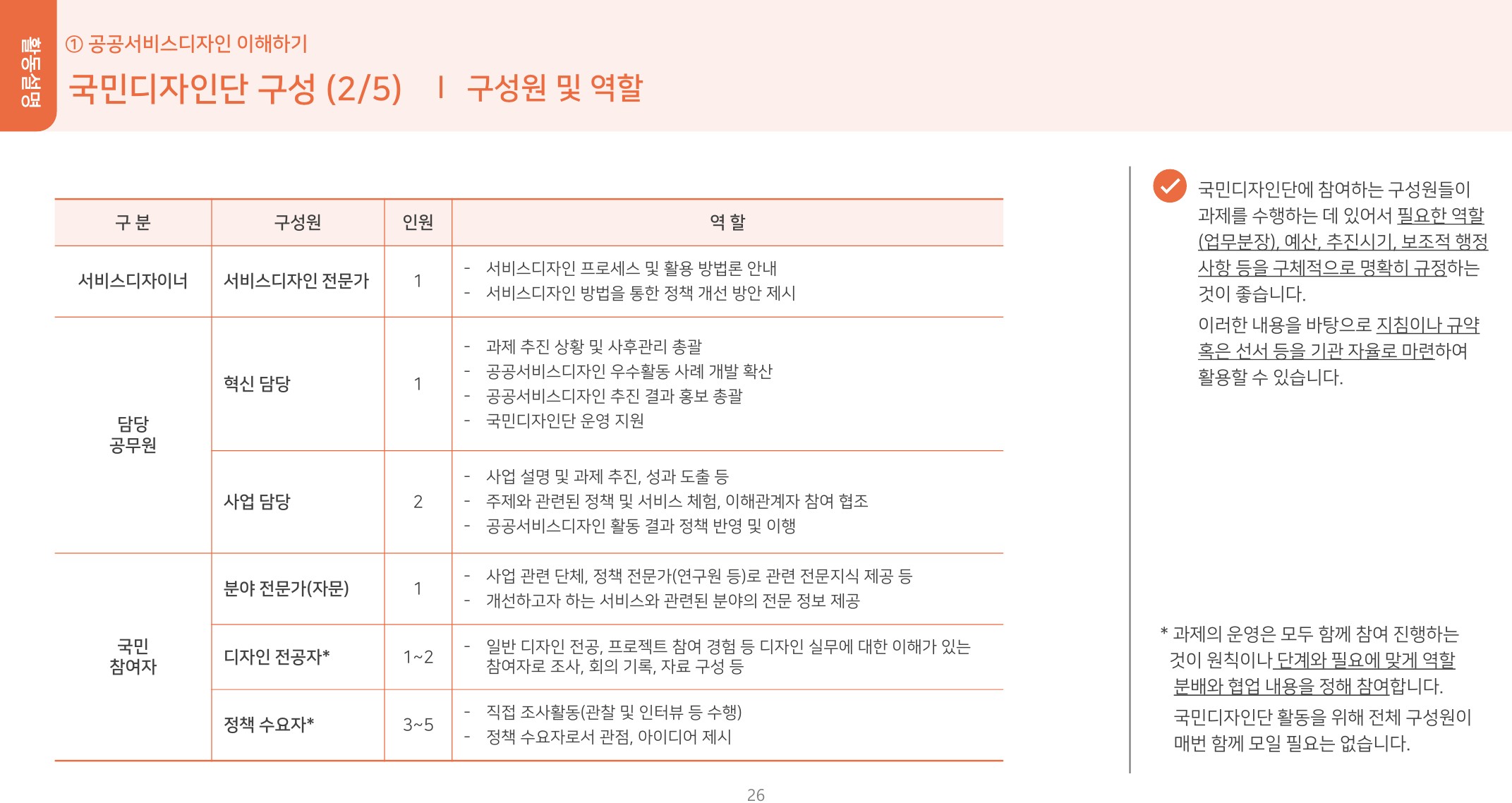 구성원: 서비스디자이너, 공무원(혁신·사업 담당), 분야 전문가, 디자인 전공자, 정책 수요자인 일반 국민으로 구성.