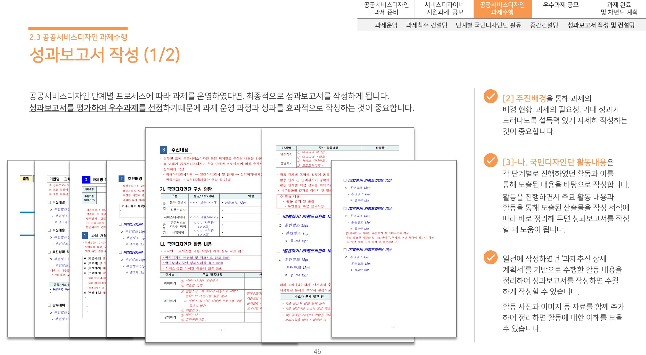 본 사업의 일환으로 마련된 운영안내서는 공공서비스디자인의 개념과 프로세스, 운영 로드맵 및 연간 운영 일정, 추진 단계별 활동 예시 등 공직자들이 공공서비스디자인 과제를 추진하는데 필요한 정보를 제공한다. 각 단계별로 작성해야 하는 공문이나 보고서 등의 예시를 구체적으로 제시하며, 현장조사, 고객여정지도 등 다양한 서비스디자인 기법에 대한 방법을 설명한다.